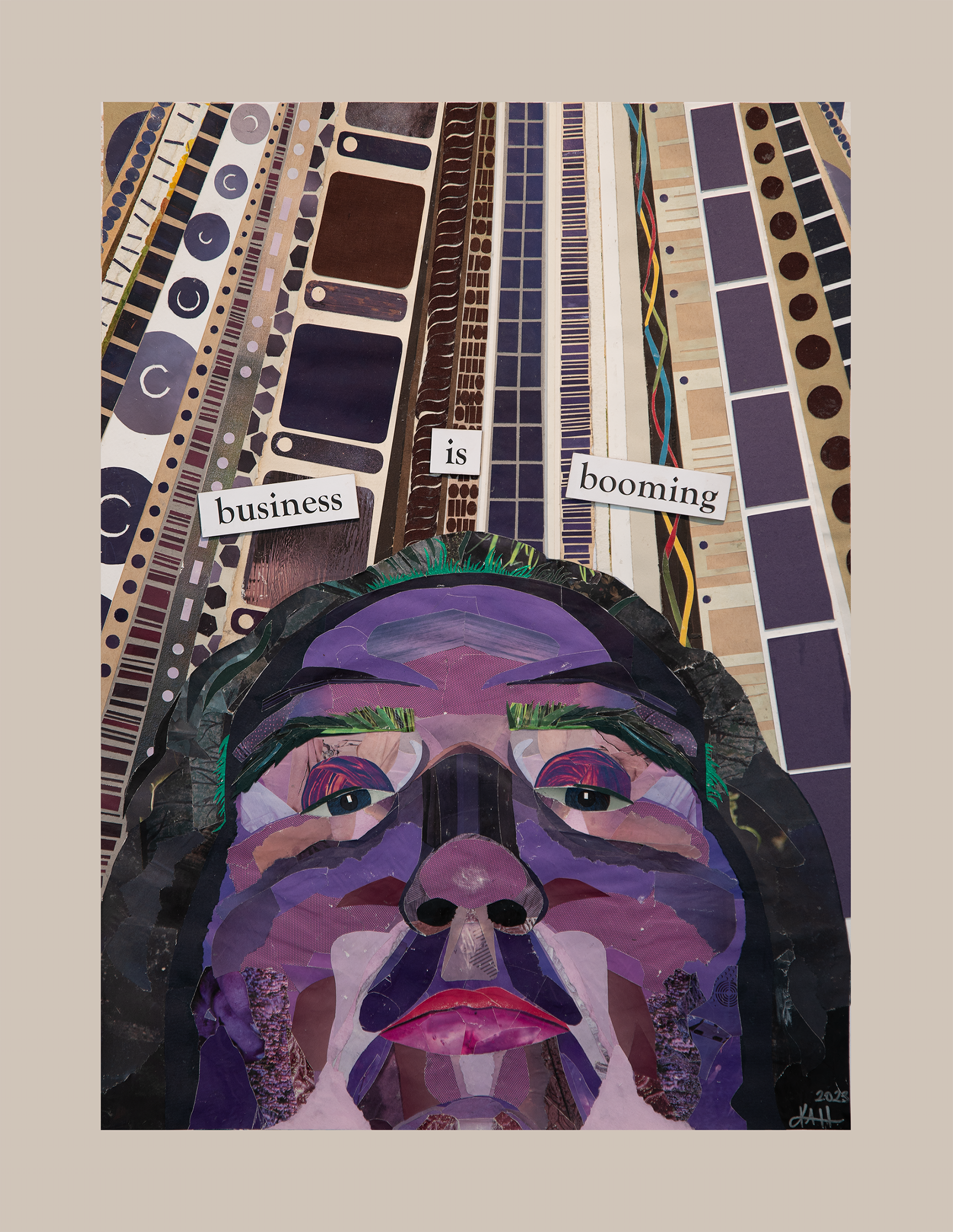 Business is Booming takes a low perspective of the subject to elongate the frenzied background patterns and to mimic the view from the subject's smartphone. This works questions how healthy it is to be mentally incorporated into a virtual world and who's greed is satiated by our digital addictions.